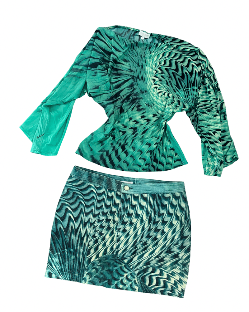 Gorgeous true vintage Roberto Cavalli Psychedelic Print set, as seen on the runway this set is in excellent condition, comes with both top and skirt. Size small, all labels attached. Measurements available upon request. Final sale.